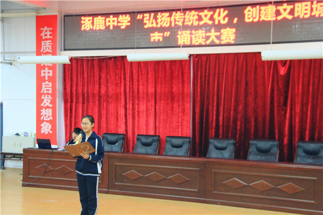 为配合涿鹿县省级文明城市创建工作,扎实推进社会公德、职业道德、家庭美德建设,提高学生个人思想品德,5月12日下午,涿鹿中学教科处联合校团委、语文中心教研组、信息中心在学生报告厅举办了“弘扬传统文化创建文明城市”朗诵比赛。教科局高中教研室张舒军主任、朱丽兰副主任、唐文辉老师、涿鹿中学校领导赵建华、何晓乐现场与同学们共同观看了比赛。 选手们精选优秀文学作品,把培育和践行社会主义核心价值观与继承弘扬中华优秀传统文化结合起来,用饱满的激情和震撼的情感将文明、礼让、诚信、宽容等优秀传统文化的美韵与精髓传递给在场的每一位师生。选手精彩的朗诵赢得现场师生热烈的掌声,比赛现场气氛热烈、欢快祥和。三位校园十大歌手的倾情演唱,更是让现场观众热情高涨。朗诵比赛取得圆满成功。 本次活动将校园文明建设、学生品德培养有机融入文明城市创建工作中,让“美德是立身之本,文明是城市之魂”的理念深入同学们的心中,让文化涵养城市发展,滋养校园生活,让同学们在参与、学习、体验中感受传统文化的魅力,提升自身文化品味。 涿鹿中学 范雪菊 翁智