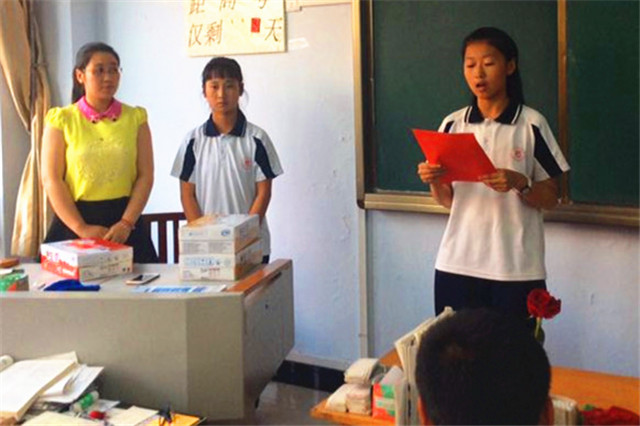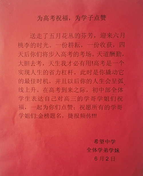 2017年高考在即,为了让高三学子更自信地走进考场,6月2日晚,希望中学发起为涿中高三学子送祝福的活动。整个校园里洋溢着温馨和谐的感人场面。 “在高考来临之际,初中部全体学生表达自己对高三学哥学姐祝福,一起为你们点赞:祝愿所有学哥学姐——金榜题名,捷报频传!” 希望中学学生代表在葛建成副校长和董巧云老师的带领下,走进高三教室,将祝福和礼物送给即将迎战高考的高三同学。饱含真情的祝福,带着浓浓关爱之情的礼物,让正在紧张备考中的高三学子倍感温馨。同学们向这些可爱的学弟学妹报以最热烈的掌声,并将自己的一些好的学习建议送给他们。 本次活动,不仅让希望中学的学生真实感受到高考的紧张氛围,还让我校高三学子真切感受到各方力量的支持,更加激发了同学们“笑赢高考”的信心和勇气。相信,在学校、家庭、社会的共同努力下,涿鹿中学高三学子定能在高考中取得优异的成绩! 涿鹿中学宣传中心 孟庆泉 郭庆全