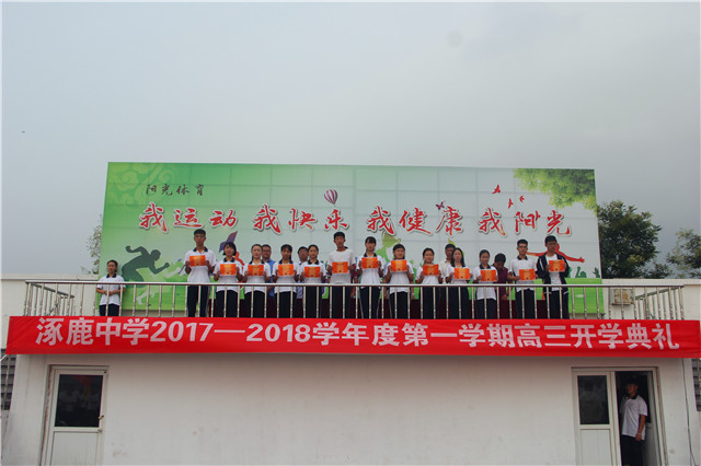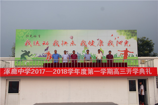 新学年、新希望、新业绩,2017年8月18日清晨,涿鹿中学校领导和高三年级1000余名师生齐聚运动场,隆重举行高三年级2017—2018学年度第一学期开学典礼。校领导赵建华、张成、杨景丹、闫慧武、赵文成、许楠楠出席,杨景丹副校长主持开学典礼。 杨景丹副校长主持开学典礼 张成副校长宣读表彰学生名单 鲜艳的五星红旗冉冉升起,嘹亮的国歌响彻校园,涿鹿中学高三年级开学典礼正式开始。张成副校长首先宣读期末统考表彰名单,校领导向获得表彰的优秀同学颁发奖状,并合影留念。 优秀学生代表高三13班刘婷婷同学表达了全体高三同学努力学习、高考必胜的坚定心声。教师代表马智勇老师、家长代表程亚峰女士分别致词,表达了教师、家长对高三学子复习备考的希望、要求和鼓励。 赵建华校长做动员讲话 赵建华校长在动员讲话中希望全体高三师生珍惜好、利用好高三时光,以明确的人生目标、扎实的知识基础、良好的学习习惯、坚定的信念信心,向管理要成绩,向态度和习惯要成绩,向规范严谨要成绩,向心理素质要成绩,师生携手,挥洒汗水,辛勤耕耘,播种希望,实现自我,创造新的辉煌! 高三年级开学典礼在全体师生面对国旗的庄严宣誓中胜利闭幕。 饱满的精神,激昂的誓言,彰显了全体高三师生刻苦拼搏、超越梦想、决胜高考的信心与决心。涿鹿中学高三全体师生将弘壮志、树新风,用自信的豪情化作利剑,扫除求学途中的重重障碍,构建涿中和谐校园,谱写涿中美好灿烂的明天! 涿鹿中学宣传中心 孟庆泉 郭庆全