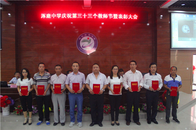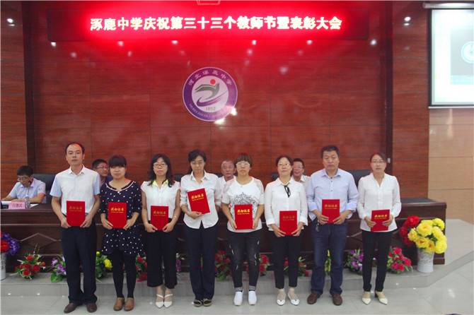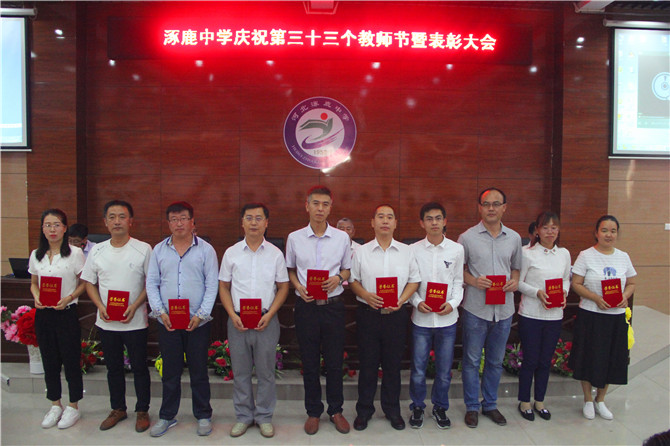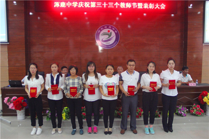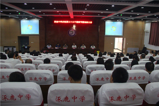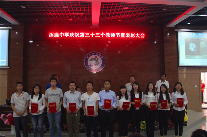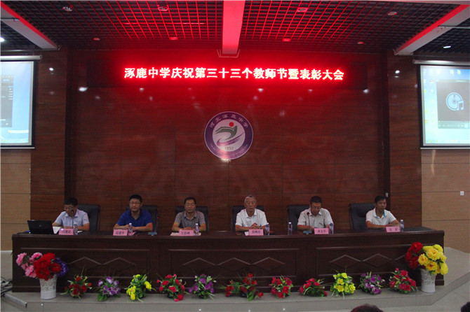 九月金秋,硕果飘香,祝福飞扬,9月9日上午,涿鹿中学全体教师齐聚报告厅,隆重举行庆祝第三十三个教师节暨表彰大会。县政府办副主任任胜峰、县教科局副局长高峰河、涿鹿中学校长赵建华、校党总支书记唐志军和支持学校发展的嘉宾出席大会。大会由闫慧武副校长主持。 大会在雄壮的国歌声中正式开始。县政府办副主任任胜峰向全体教师宣读了县委、县政府的节日慰问信,向全体教师致以崇高的敬意和衷心的感谢。 在喜庆祥和的氛围中,赵建华校长向全体教师致以节日的问候,并向出席本次大会的各位领导和一直以来关心支持涿中发展的各级领导和社会各界人士表示由衷的感谢。在致辞中,赵校长强调,面对我县创建文明城市和学校发展的新任务,希望全体教师忠诚教育,做到敬岗爱业,忠于职守;树立终身学习的观念,不断学习,与时俱进;勇于创新,增强办学竞争力,在工作中不断创造新业绩,共同创造涿鹿中学的新辉煌,以更加优异的成绩回报各级领导和社会各界朋友的支持。 大会对为学校教育事业发展做出突出贡献的教师进行了隆重表彰。唐志军书记宣读了教师节表彰决定及名单,出席大会的领导为获奖教师颁奖,用成绩和荣誉对教师们的辛勤付出给予肯定和祝贺。 优秀教师代表张雪老师进行了发言,彰显了涿中人崇高的精神风貌和开拓创新、脚踏实地、无私奉献的敬业精神。 会上,县教科局副局长高峰河做重要讲话。高局长对涿鹿中学取得的成绩给以充分肯定,希望全体教师能够一如既往地爱岗敬业、关爱学生,以人民教师的人格魅力、道德魅力、学识魅力影响和教育学生,成为学生健康成长的指导者和引路人,力争以一流的业绩、务实的作风,向全县人民交上一份满意的答卷,为全县教育腾飞,做出新的贡献。 晨曦细雨育桃李,金秋硕果慰园丁。全体涿中人将豪情满怀,齐心协力,以严谨科学的态度、诲人不倦的品格,共同开创涿鹿中学的新辉煌! 出席庆祝大会的嘉宾有:涿鹿县县医院副院长王志湖先生、涿鹿县供电公司工会主席田杰先生、河北千喜鹤餐饮股份有限公司经理伊海婴先生、联通涿鹿分工公司副局长兰海军先生、河北工商银行涿鹿支行徐万斌先生、河北人寿涿鹿分公司张国利女士、金太阳集团区域经理冀利军先生、北京金诚乐莱科技有限公司经理王兴龙先生、千年虫电脑服务公司张丽平女士、纯净水生产公司经理董孝庆先生、涿鹿县校园万卷书吧经理杨庆忠先生、涿鹿县全新保洁服务有限公司经理王永彪先生、君泰广告设计中心经理秦明君先生。